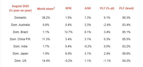 El mercado doméstico, mientras tanto, mostró un avance más moderado con un 1,5 %, aportando solamente el 13 % del crecimiento global, lo que representó una caída significativa frente al 25 % de participación que registró en agosto de 2024. El factor de ocupación nacional fue del 86,3 %, que significó una leve mejor de 0,1 puntos porcentuales.