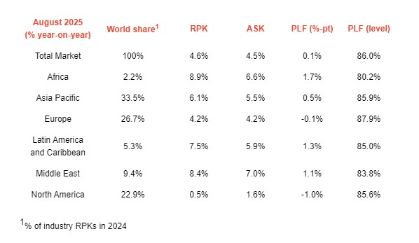 De acuerdo con el más reciente reporte de IATA, correspondiente a agosto, la demanda mundial — los pasajeros-kilómetro de ingresos (RPK)—de pasajeros creció un 4,6 % respecto al mismo mes del año anterior. Así mismo, la capacidad global —medida en asientos-kilómetro disponibles (ASK)— aumentó un 4,5 %, lo que permitió alcanzar un factor de ocupación del 86 %, el mas alto registrado para ese mes.