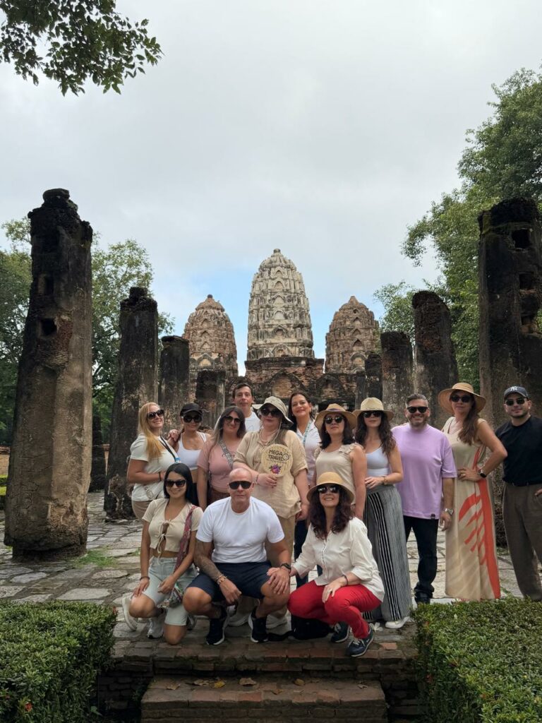 El itinerario también incluyó una visita al puente Tham Krasae, una histórica estructura de madera suspendida sobre un acantilado, seguida del icónico puente sobre el río Kwai. Después del almuerzo en un restaurante típico, el grupo se trasladó a Ayutthaya, antigua capital del Reino de Siam y declarada Patrimonio de la Humanidad por la UNESCO. Allí recorrieron el templo Chai Wattanaram, una muestra imponente del legado arquitectónico tailandés.