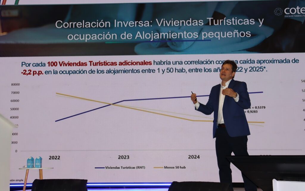 - “Por cada 10 viviendas turísticas adicionales, habría una correlación de una caída aproximada del -2,2 puntos porcentuales en la ocupación de los alojamientos entre 1 y 50 habitaciones, entre los años 2022 y 2025”, afirmó Duarte. Los hoteles de menos de 50 habitaciones constituyen el 90 % de la hotelería en Colombia.