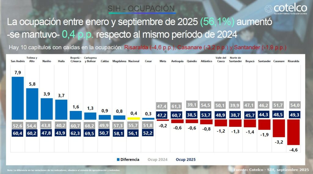 - Según el Sistema de Información Hotelero (SIH) de Cotelco, entre enero y septiembre la ocupación hotelera se situó en 56,1 %, lo que indica un leve aumento de 0,4 puntos porcentuales frente a 2024.