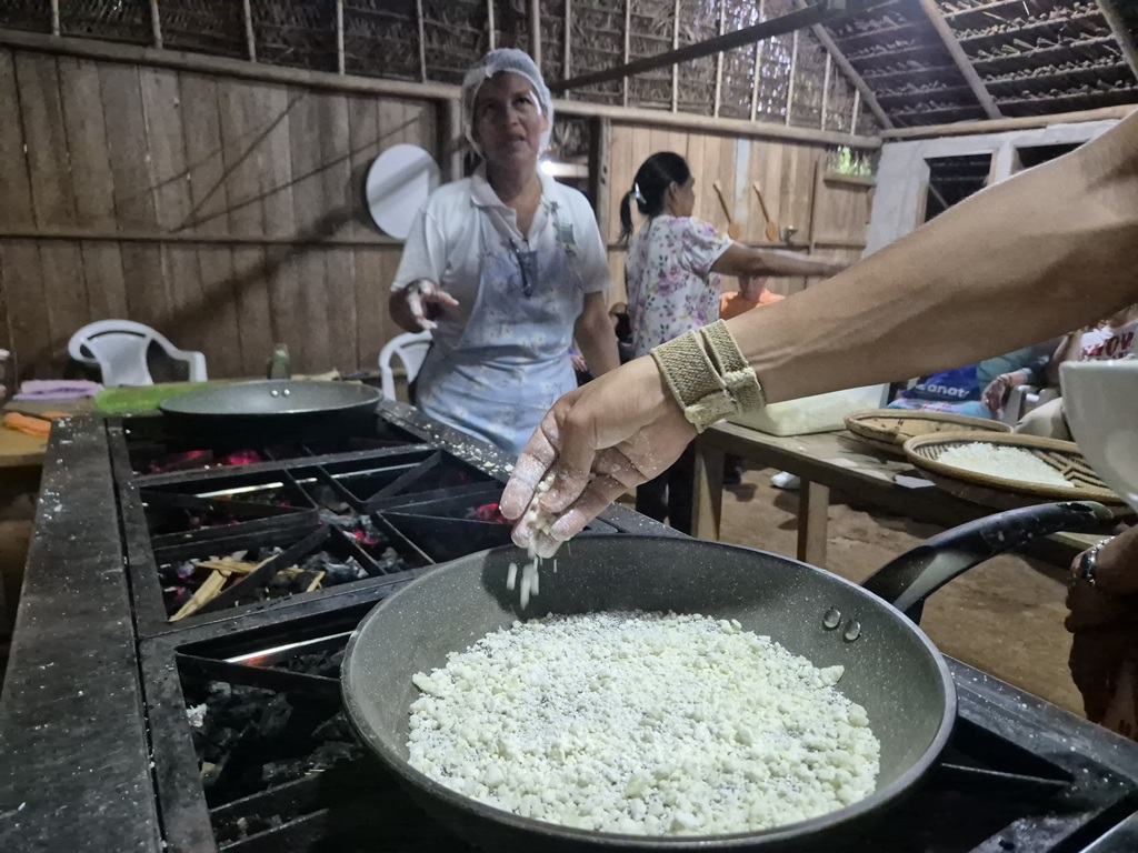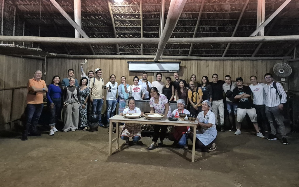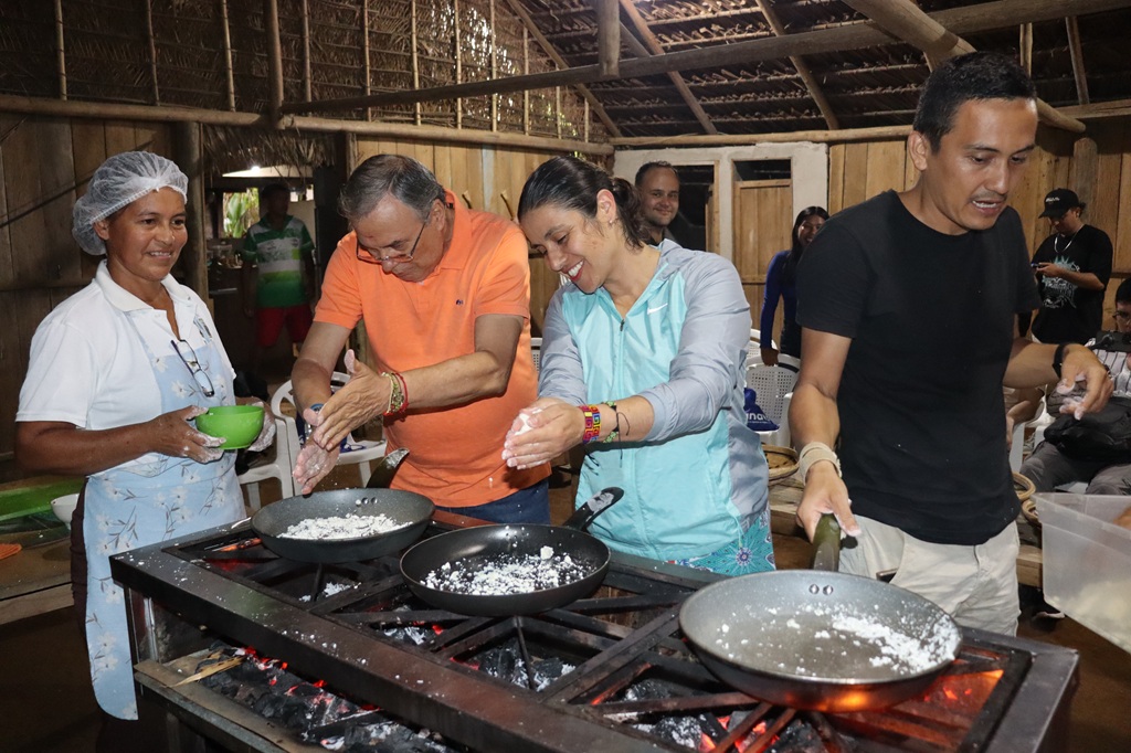 A propósito de gastronomía amazónica, la jornada cerró con una de las apuestas más atractivas del municipio: un taller de elaboración de casabe en el restaurante Ba’Aribo; el dios del alimento para el pueblo desana. “Él fue quien nos enseñó las pautas de cultivar, cuidar, cosechar, mantener y preparar los alimentos”, afirma Edilma Caicedo, líder de este emprendimiento familiar que busca rescatar las tradiciones culinarias del territorio.