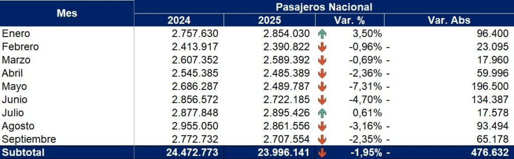 En septiembre la tendencia fue la misma: los pasajeros internacionales llegaron 1.931.000 (+2,4 %), mientras que los nacionales fueron 2.707.000 (-2,3 %). “Este comportamiento puede estar asociado a factores de costos, además de tener implicaciones relevantes para el turismo interno y las economías regionales que dependen de la conectividad aérea para atraer visitantes”, señaló Paula Cortés Calle, presidente de Anato.