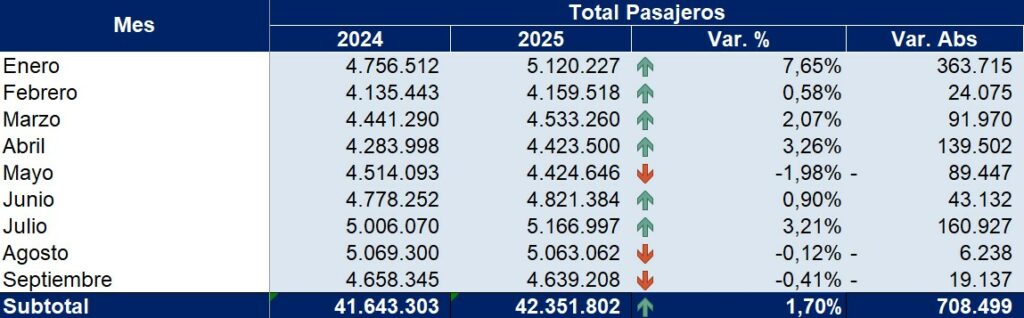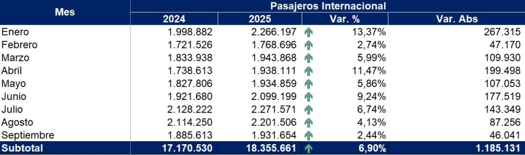 Mientras en 2024 los pasajeros internacionales crecían a doble dígito (versus 2023) —febrero (+36,8 %), marzo (+27,5 %), mayo (+14,9 %), septiembre (+13,4 %)— en este año los incrementos del tráfico internacional han sido considerablemente inferiores: febrero (+2,7 %), marzo (+5,9 %), mayo (+5,8 %) y septiembre (+2,4 %).