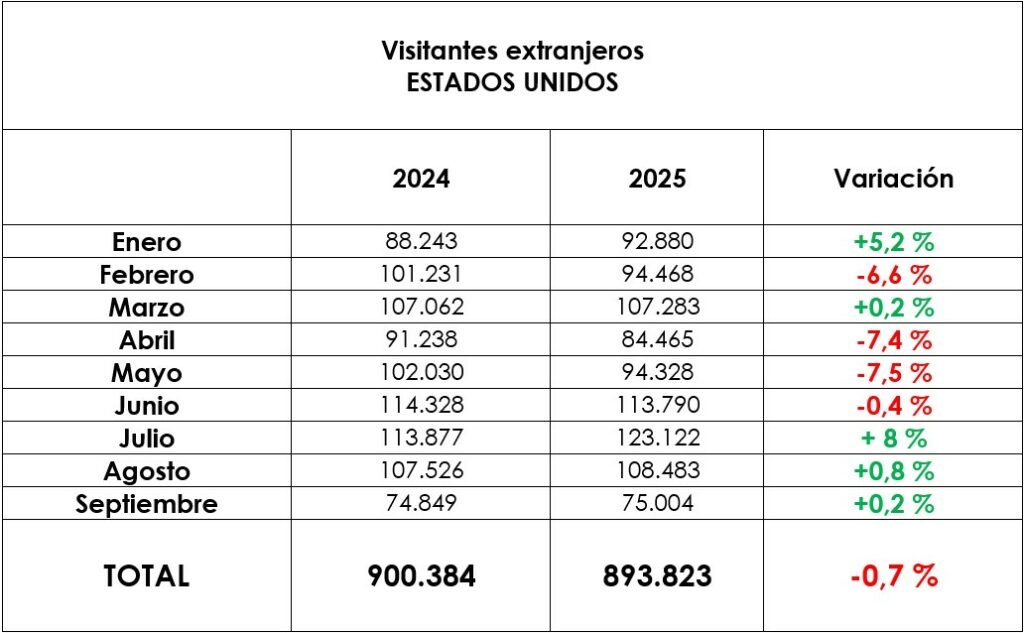 Con este flujo en caída libre, no fue extraño que la cifra total de visitantes no residentes arrojará un balance negativo en el periodo enero-septiembre de 2025. De hecho, esta disminución ya había ocurrido en el periodo enero-agosto, cuando se registró una reducción de -2 % frente al mismo periodo de 2024.