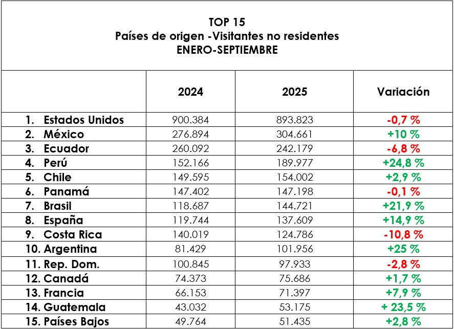 El top 10 es completado por Panamá (-0,1 %), Brasil (+22 %), España (+15 %), Costa Rica (-10,8 %) y Argentina (+25 %). Cabe señalar que en este ranking se excluyeron los visitantes con residencia venezolana. En el top 10 de países emisores solo figura una nación europea.