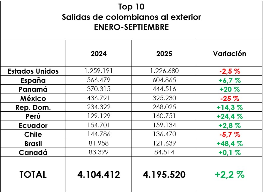 En el caso de las salidas de colombianos al exterior —un flujo que permite ilustrar, en alguna medida, el turismo emisivo en Colombia— las cifras disponibles vienen por cuenta de Migración Colombia. Según estas estadísticas, entre enero y septiembre de este año salieron del país 4.195.520 colombianos, un +2,2 % mas que los 4.104.412 que viajaron el año pasado.