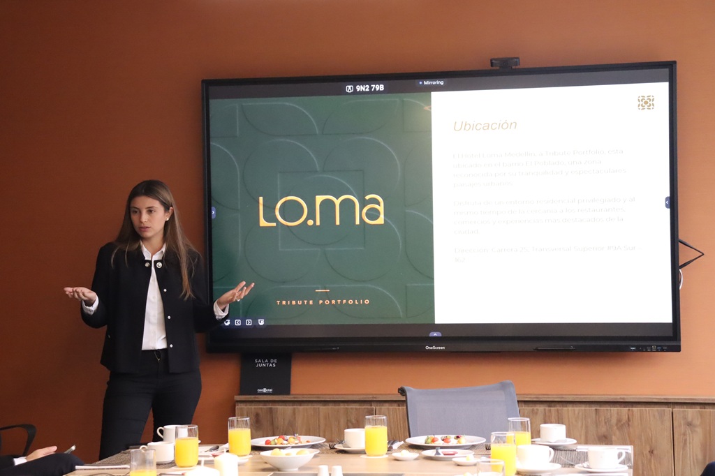 María Alejandra Pombo, gerente de LOMA, explicó a los agentes de viajes la propuesta de este hotel boutique en torno a tres pilares que definen su esencia: El Nodo Creativo, concebido como un punto de encuentro para la movida artística de Medellín; la Cultura Local, que se refleja en cada detalle del hotel, desde la arquitectura hasta la ambientación; y el concepto de Bienestar Urbano, que invita a un estilo de vida equilibrado, conectando cuerpo, mente y entorno mediante espacios diseñados para armonizar trabajo, descanso y entretenimiento.