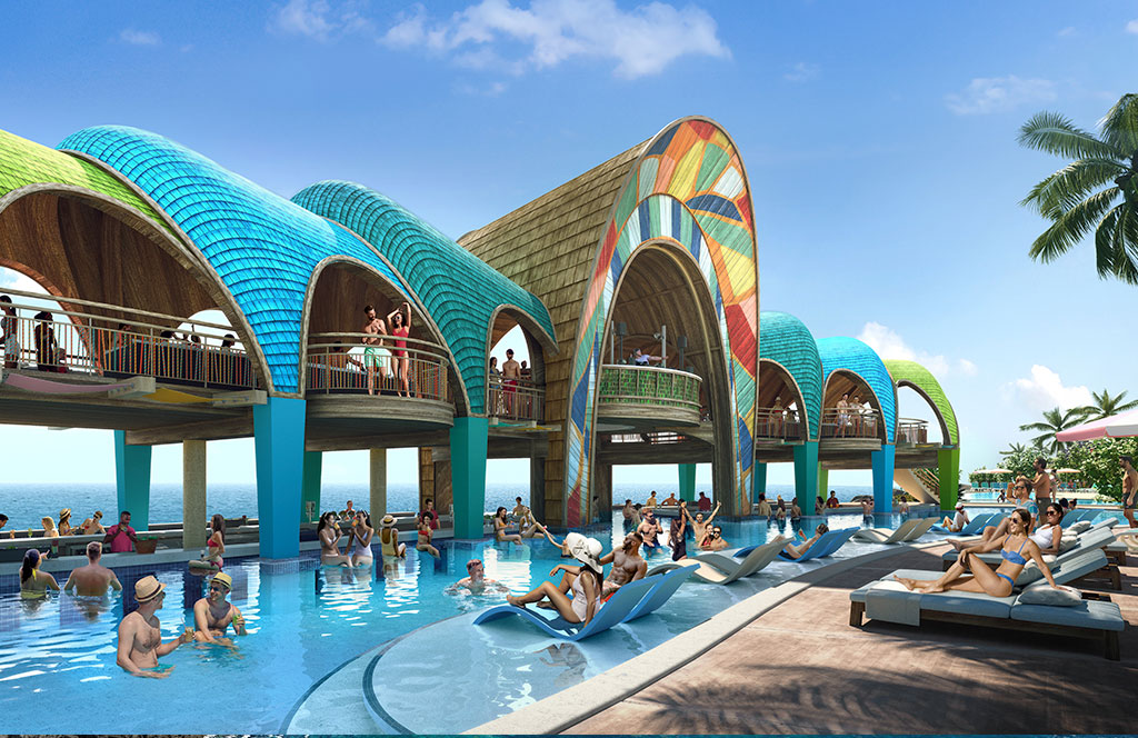 Entre sus principales atractivos se encuentran dos playas privadas, tres piscinas y diez bares, incluyendo tres con acceso directo desde el agua. Destaca especialmente el “Floating Flamingo”, considerado el bar acuático más grande del mundo, ubicado en el área denominada Party Cove, orientada al entretenimiento y la diversión.