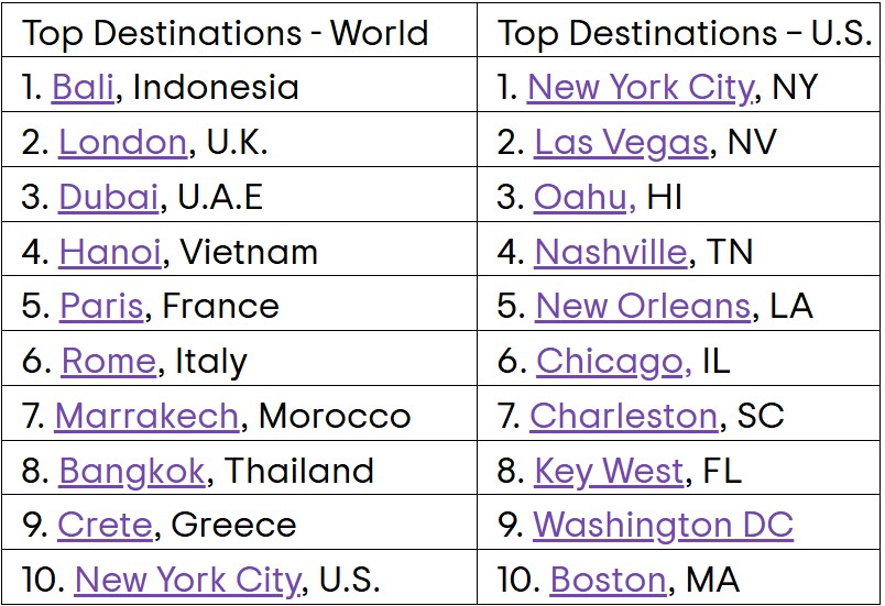 En cuanto a los destinos tendencia (Trending Destinations), los viajeros eligieron mayoritariamente a Madeira (Portugal), seguida de Tbilisi (Georgia), Chicago, Quy Nhon (Vietnam) y Puerto Escondido (México). Recife (Brasil), en el 9º lugar, y San Carlos de Bariloche (Argentina), en el 10º, fueron los otros dos destinos suramericanos mencionados en el top 10.