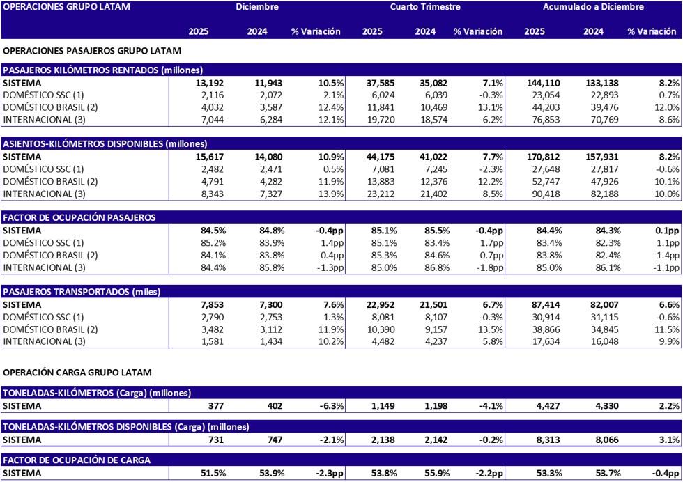 Este crecimiento fue impulsado, principalmente, por la oferta doméstica de Latam Airlines Brasil (+11,9 %) y por el aumento de +13,9% en la operación internacional. En el último mes de 2025 se inauguraron 10 nuevas rutas, destacándose dos internacionales de largo alcance: Santiago de Chile–Buenos Aires (Ezeiza)–Miami y Guayaquil–Nueva York.
