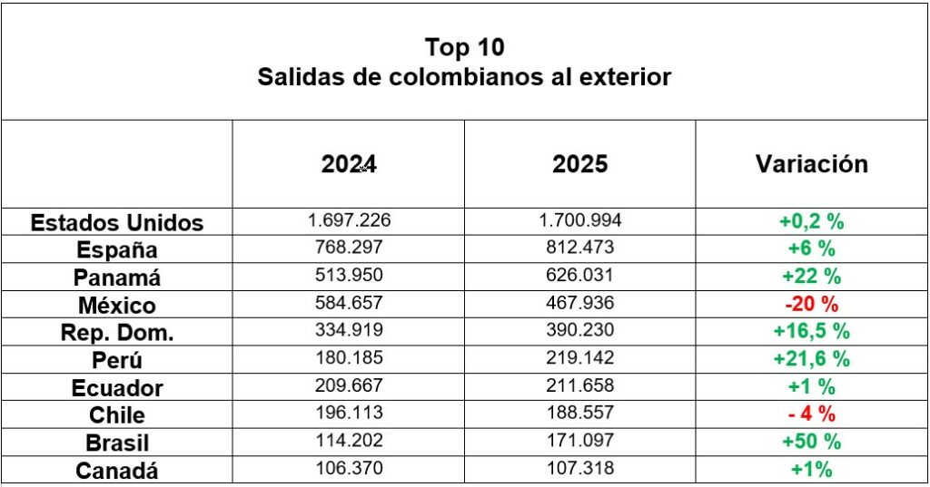 Según los registros de Migración Colombia, durante 2025, un total de 5.816.000 colombianos viajaron al exterior, lo que representó un crecimiento de 4,3 % frente a los 5.574.000 que salieron del país en 2024. salidas de colombianos al exterior 2025