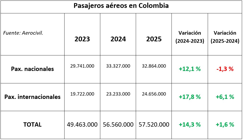 De acuerdo con las estadísticas preliminares de Aerocivil, en 2025 se registraron un total de 57.520.767 pasajeros aéreos, lo que indica un crecimiento de +1,6 % respecto al 2024.