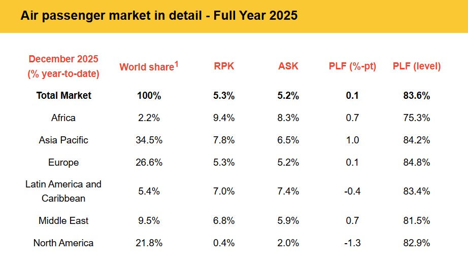 Según los datos publicados por IATA, el desempeño del mercado de pasajeros para 2025 y diciembre de 2025 evidenció una demanda récord. El aumento para el total del periodo en comparación con 2024 fue de +5,3 %. En diciembre pasado, por su parte, el crecimiento fue de +5,6 % frente a diciembre del 2024.
