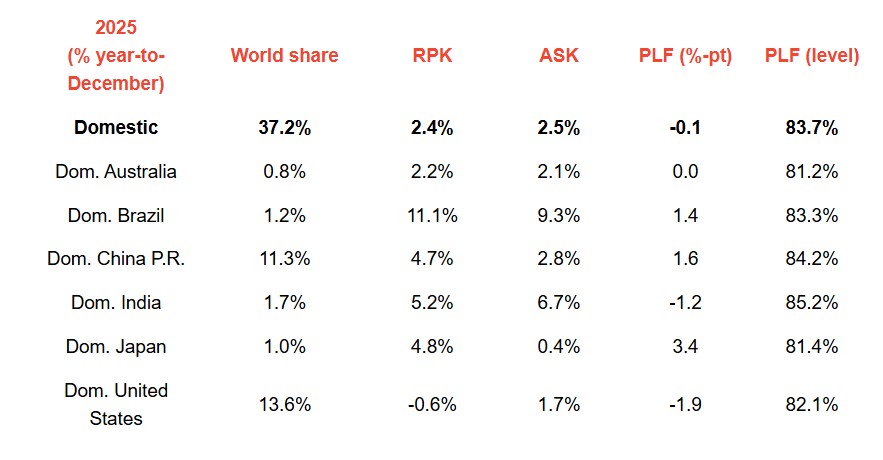 El mercado nacional con mejor desempeño en RPK en 2025 fue Brasil, que aumentó un 11,1% con respecto a 2024. Estados Unidos vio su mercado nacional contraerse un -0,6%. El mayor aumento del factor de ocupación se registró en Japón (+3,4 puntos porcentuales), a diferencia de Estados Unidos, que registró la caída más pronunciada (-1,9 puntos porcentuales).