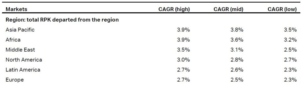 Según el escenario Medio, la demanda pasará de nueve billones de RPK (pasajeros transportados por kilómetro volado) en 2024, a 20,8 billones de RPK en 2050, para una tasa de crecimiento anual de +3,1 %. Por su parte, el escenario de mayor crecimiento (+3,3 %) proyecta 21,9 billones de RPK en 2050; y el de menor crecimiento (+2,9 %), una demanda de 19,5 billones de RPK.