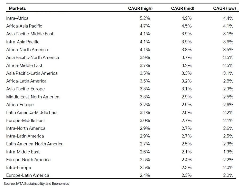 Ateniéndonos solamente al escenario medio, cinco grandes flujos liderarán el crecimiento de aquí al 2050: Intra-África (+4,9 %), África-Asia Pacífico (4,5 %), Asia Pacífico-Oriente Medio (3,9 %), Intra-Asia Pacífico (3,9 %) y África-Norteamérica (3,8 %) y Asia Pacífico-Norteamérica (+3,7 %).