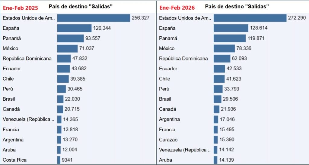 Finalmente, las estadísticas de flujos migratorios calculadas por Migración Colombia revelan también un comportamiento positivo de las salidas de colombianos al exterior en los primeros dos meses del año. En enero y febrero se registraron 992.248 salidas de colombianos, un crecimiento de +12 % frente a las 883.116 registradas en el mismo periodo del 2025.