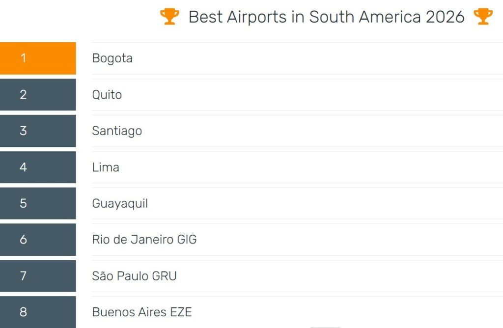 Ante el dominio asiático —que suele ser el común denominador en este tipo de rankings— América también tiene sus propias distinciones. Detrás del aeropuerto El Dorado, ejemplo, se ubicaron, en su orden, los aeropuertos de Quito, Santiago de Chile, Guayaquil, Rio de Janeiro GIG, Sao Paulo GRU y Buenos Aires EZE.